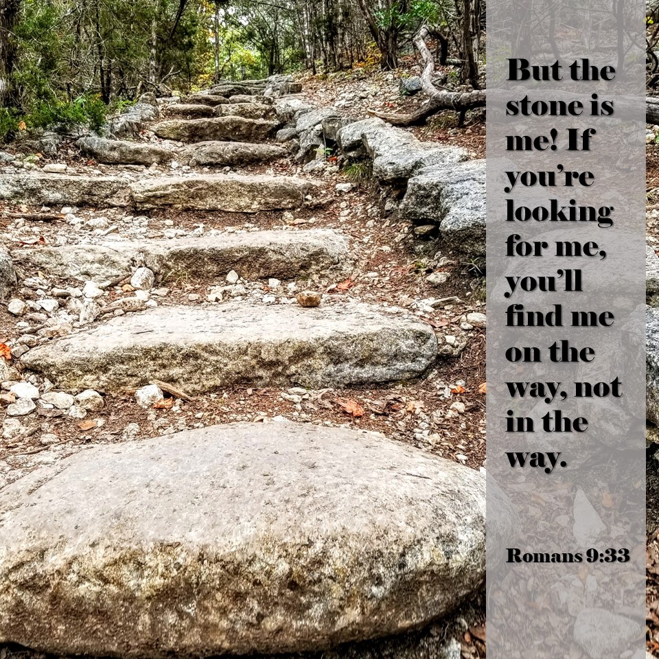 Careful! I’ve put a huge stone on the road to Mount Zion, a stone you can’t get around. But the stone is me! If you’re looking for me, you’ll find me on the way, not in the way. (v30-33, MSG). Isaiah 8:14 and 28:16.