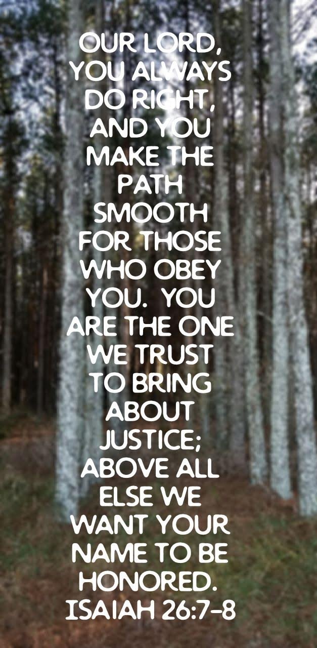 “Our Lord, you always do right, and you make the path smooth for those who obey you. You are the one we trust to bring about justice; above all else we want your name to be honored.”
