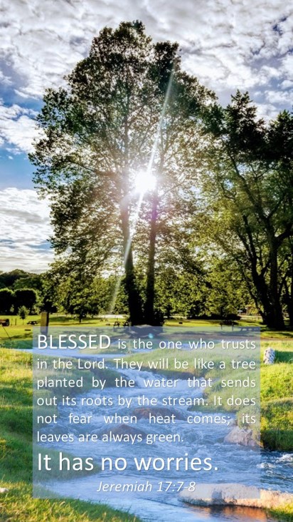 “But blessed is the one who trusts in the Lord, whose confidence is in him. They will be like a tree planted by the water that sends out its roots by the stream. It does not fear when heat comes; its leaves are always green. It has no worries in a year of drought and never fails to bear fruit.” Jeremiah 17:7-8 (NIV)