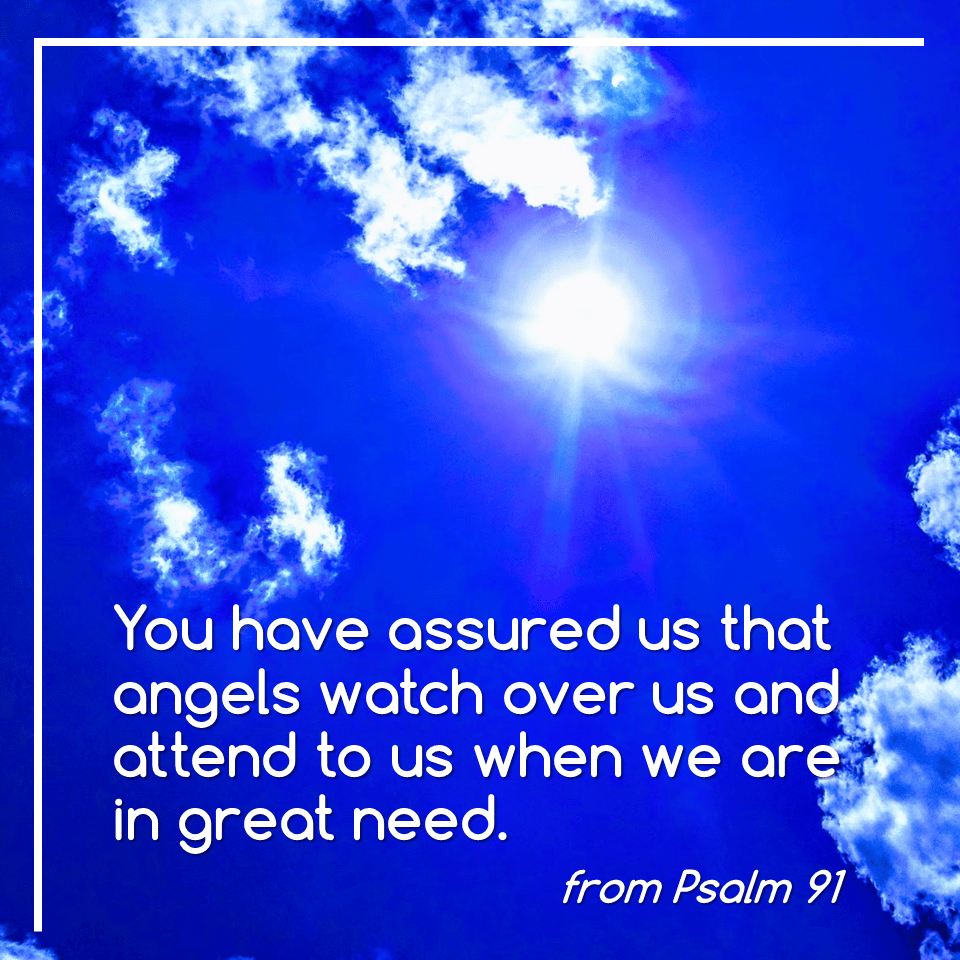 You have assured us that angels watch over us and attend to us when we are in great need. They guard us and carry us. They surround our homes and walk with us every day. We will not stumble or fall. We will not be attacked by any wild thing. Thank you, God, for the promise that if we hang on to you with all our might, if we love you with our voices and our actions, when we call on you, you will answer us, you will protect us, you will be at our side, you will rescue us. Thank you!