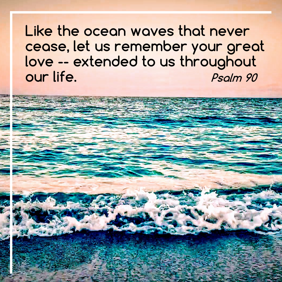 Teach us to make every day count. Let us celebrate you each morning with great joy! Let us count our blessings today. Let us look with gratitude on the days we have lived. Like the ocean waves that never cease, let us remember your great love — extended to us through our life experiences, our family and friends, to our times of worship to you, our great King; your faithfulness will extend throughout all eternity. We confess that it’s difficult for us to get our head around that, but we trust you and we look forward to an endless season in your presence.