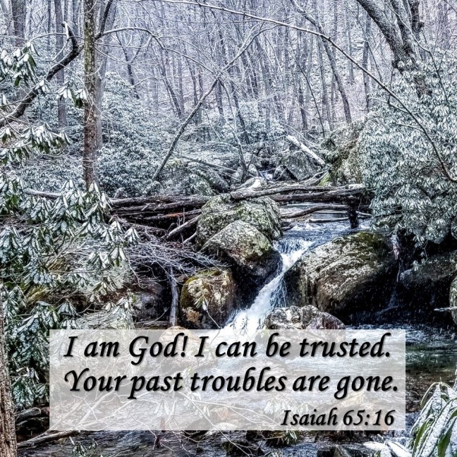 “I am God! I can be trusted. Your past troubles are gone; I no longer think of them. I am creating new heavens and a new earth. Everything of the past will be forgotten.” (v16-17, CEV).